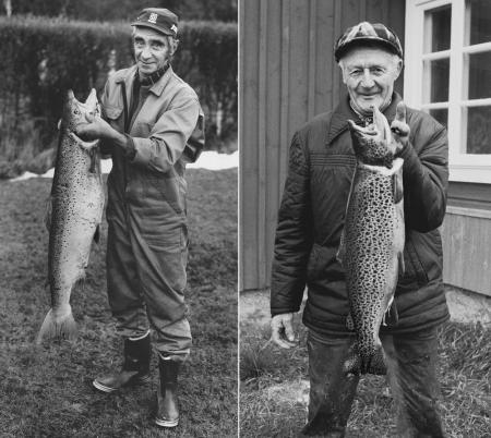 Glada laxar på 1980-talet, Runar Björk och Alvar Finne i Österhankmo. Björk med havslax på tio kilo och Finne med regnbågsforell av lite mindre storlek. Foto Mikael Herrgård.