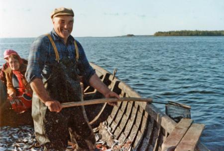 Johannes Björk, handelsman (Specialbutiken) och fiskare, under strömmingsfiske med ryssja vid Öjskatan på 1970-talet. Hustrun Karin till vänster. Malgrund och Pudimo (Maxmo) i bakgrunden.