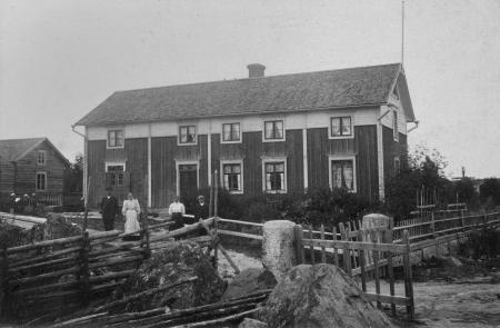 Johannes (1869-1928) och Emma (1882-1960) Råback med Johannes barn, Edit och Johannes, från första giftet. Till höger skymtar Nybondis och en väderkvarn vid Norrgos (Ingman).
