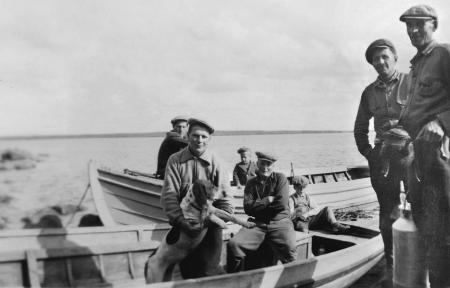 Vid Öskatan på 1950-talet. I förgrunden Arthur Ståhlberg med hunden, Eskil Finne, Samuel Finne samt Gustav och Arvid Nygård.