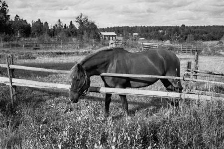 Rurik Råbacks häst Freja 1982. Hästhagen är den gamla soldatåkern öster om soldattorpet Nr 23 Källdnäs. I bakgrunden en riugn från en riven ria, samt Maria Nyströms stuga (Urmakaris). Foto Mikael Herrgård.