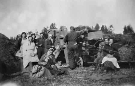 Tröskning (Tröskankalas) söder i byn tidigt 1950-tal. Från vänster Birgit Frilund, Laura Ståhlberg, Sonja Nordberg, Arthur Ståhlberg, Gunnar Nygård, Edit Vingård, Lisen Ståhlberg, Albin Granberg, Karl Vingård och Hildeborg Frilund.