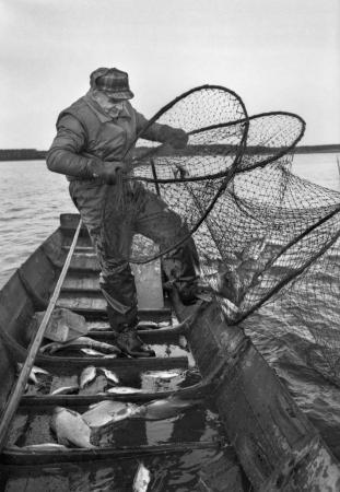 Gunnar Rönnberg fiskar braxen i Kyro älv vid Hagnäs (Vassorfjärden) 1990. Foto Mikael Herrgård.