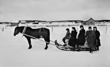 Södra Vassor 1951. Från vänster: Harry Wik, Saga Örnberg (f. Wik) vid tömmarna, Elin Friberg, Karl Erik och Alli Petersson (f. Wik).