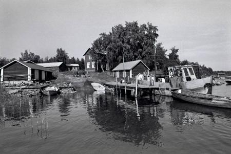 Hamnen vid Gårdarna på Mickelsörarna, Idas stuga i mitten längst bort. Bild från 1979. Foto Mikael Herrgård.