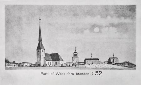 Vykort av Wasa före branden 3.8 1852. Kyrkan, klockstapeln, rådhuset, trivialskolan.