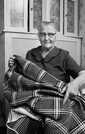 Mari Åkerholm (1895-1978) 1976 bosatt på Pudimo (gamla Pudemoskär) i Maxmo skärgård med sin dotter Anni Sandqvist. De båda upprätthöll traditionen, sedan 1889, med babtisternas och pingstvännernas årliga friluftsmöte på Pudimo. Mötet var vida känt och välbesökt. Mari vävde bla. över hundra Maxmo sängtäcken. Foto Mikael Herrgård