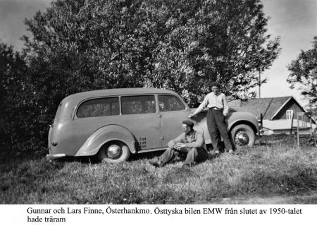 Far och son, Gunnar och Lars Finne, Österhamkmo. Östtyska bilen EMW från slutet av 1950-talet hade träram.