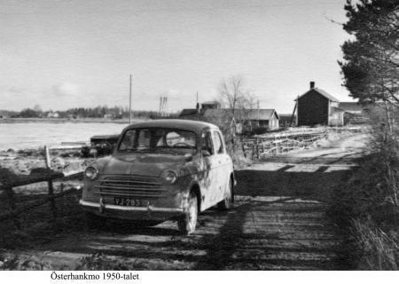 Österhankmovägen vid Bystranden (centrum av byn) med samfällda båtplatser. Bakom Oskar och Tilda Erikssons stuga norr om Hocklot.