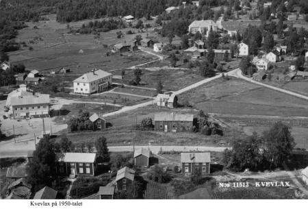 Kvevlax centrum på 1950-talet. Vänster: Kvevlax Andelshandel byggdes 1949 och kommunalgården 1951. Framför kyrkan står Sockenstugan som revs 1959. Församlingshemmet saknas, det invigdes 1960. Caféet "Fattiga rosen", mitt på bilden längs "Langgaton", revs i början av 1960-talet.