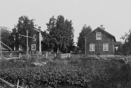 Prästgården och nya klockargården. I mitten Sockenlåningsmagasinet och prästboden. Till höger skymtar klockaren Hanelius gård. Troligen bild från 1930-talet.