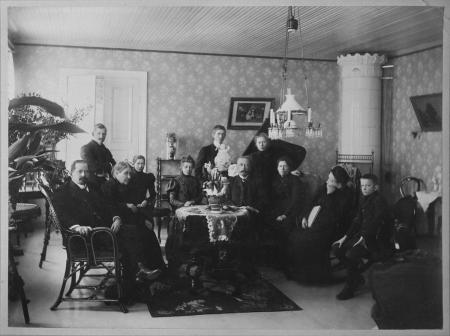 Kvevlax prästgård stora salen 23 mars 1908 (troligen i samband med K E Karstens begravning). Sittande från vänster: Tor Karsten, Etta Cajanus, Signe Karsten, Ellen Karsten, Yrjö Alanen, Helmi Alanen, Emma Karsten, Aarne Alanen. Stående: Rafael Karsten, Aulis Alanen (?), Sylvi Alanen (?).