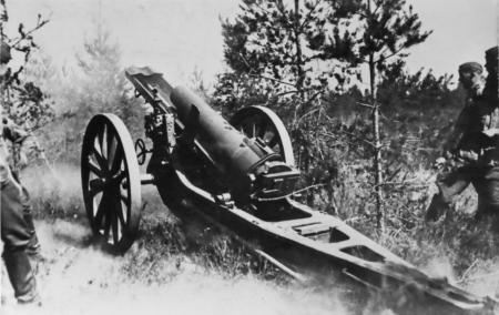 Haubits i Finland på 1920-talet. Rekylen i avfyrningsögonblicket är i sitt bakersta läge.