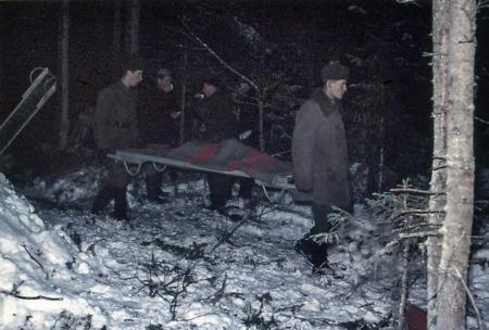 Tjugofem personer omkom när Aeros plan (DC 3) på väg från Kronoby till Vasa störtade i Kvevlax 3 januari 1961. Foto Börje Snickars.