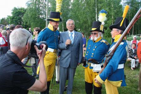 Svenskarnas landstigningsplats midsommaren 1808 (1808-1809-års krig) i Österhankmo vid Kalkmagasin (Plassin gammalt namn). Minnesstenen avtäcktes midsommar annandag 2008. Vasabladets Gunnar Bäckman fotograferar Göran Backman, Nils-Erik Nykvist, Hans Olin och Torsten Onnela. Foto Mikael Herrgård.
