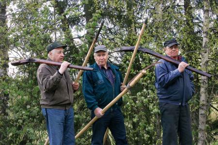 Svenskarnas landstigningsplats midsommaren 1808 (1808-1809-års krig) i Österhankmo. Böndernas vapen sälbössor, liar och pikar förevisas av Alf Svahn, Henrik Westerback och Ralf Nylund. Lien och piken är rekonstruktioner. Foto Mikael Herrgård.