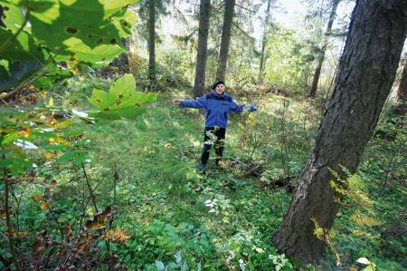 ”Ryssgropen” där stupade ryssar enligt sägnen begravdes i en skogsdunge intill Kråklundsvägen med höghus mot öster och Alkula i väster. Foto Mikael Herrgård.