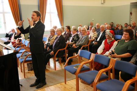 Kvevlax Hembygdsförenings 40-års fest 30. 9 2018 i Kvevlax församlingshem. Dirigenten Simon Granlund dirigerar Kvevlaxkören. Foto Mikael Herrgård.