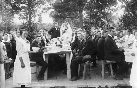 Bröllop 24.6 1922 mellan Elsa Knip och Johannes Findahl från Österhankmo. Bland bröllopsgästerna ses i förgrunden Ida Källskata med soppskålen. Johannes emigrerade till Kanada 1924, han återvände inte och dödförklarades 1965 i Amerika (Elsa 1889-1971, Johannes 1892-1965).