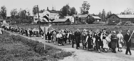 Sångfesten i Kvevlax 16-17 juni. Processionen efter festgudstjänsten i kyrka går till ungdomslokalen där sångfesten hölls.