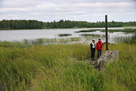 Korsformade farledsmärken i Kyro älvs nedre lopp mellan Vassor och Tottesund från början av 1900-talet. Bytesholmen, Tottesund. Endast stolpen kvar, ingjutet vid foten: ST: I BOCHUM 1901. Mittemot (väster) på Fransesgrundet en stenkista som troligen också innehållit ett farledsmärke. Yngve Svarvar och Viking Åberg dokumenterar märkena. Foto Mikael Herrgård 2019.