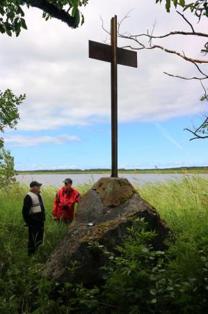 Korsformade farledsmärken i Kyro älvs nedre lopp mellan Vassor och Tottesund från början av 1900-talet. Björnholmens norra rev i Vassor. Bäst bevarade märket, fin plats på släta klippor. Ingjutet i foten: UNION 1895. Yngve Svarvar och Viking Åberg dokumenterar märkena. Foto Mikael Herrgård 2019.