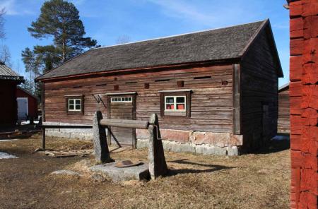 Fähus (föuse) från Överby i Kvevlax. Fähuset, uppfört ca 1880, ägdes äv husbönderna vid Nyysto (Brännmark) och senare Bondis (Hjortman). Fähuset flyttade till Stundars museum 1975. På fähusets baksida finns många fina ristningar synliga i bra ljus. Foto Mikael Herrgård.