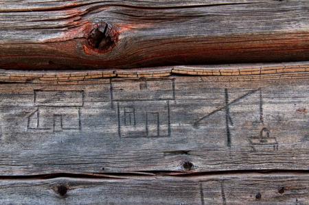 Inristningar på fähus (föuse) från Överby i Kvevlax uppfört ca 1880 (vid Stundars sedan 1975). På fähusets baksida finns ett hundratal fina bevarade ristningar med initialer och ett mer berättande bildspråk. Foto Mikael Herrgård.
