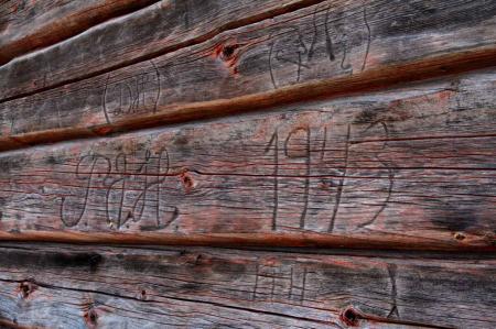 Inristningar på fähus (föuse) från Överby i Kvevlax uppfört ca 1880 (vid Stundars sedan 1975). På fähusets baksida finns ett hundratal fina bevarade ristningar med initialer och ett mer berättande bildspråk. Foto Mikael Herrgård.