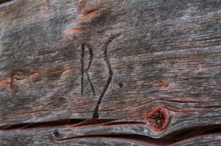 Inristningar på fähus (föuse) från Överby i Kvevlax uppfört ca 1880 (vid Stundars sedan 1975). På fähusets baksida finns ett hundratal fina bevarade ristningar med initialer och ett mer berättande bildspråk. Foto Mikael Herrgård.