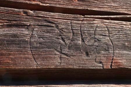 Inristningar på fähus (föuse) från Överby i Kvevlax uppfört ca 1880 (vid Stundars sedan 1975). På fähusets baksida finns ett hundratal fina bevarade ristningar med initialer och ett mer berättande bildspråk. Foto Mikael Herrgård.