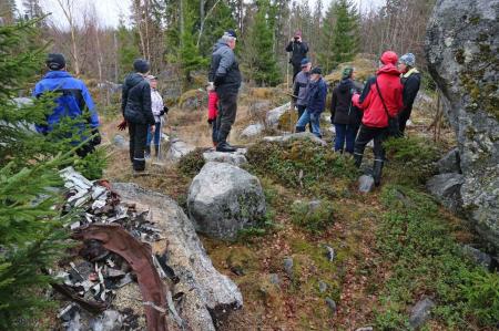 Mälsor, flygolycksplatsen 1958 där flygvapnets Fokkerplan störtade i snöyra 25 januari. Båda besättningsmännen omkom. Hembygdsföreningens styrelse besökte den steniga terrängen våren 2018. På stenen finns ännu några metallrester som härstammar från planet. Foto Mikael Herrgård.