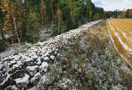 Fornminne, odlingsröse vid Lappasåkern (Norrviks sveden) längs vägen ut till Petsmo och Hankmobyarna. Odlingen stenröjdes i mitten av 1800-talet av Matts Nygård och sonen Mickel Hurr. De röjda åkrarna gav bra brödsäd. Foto Mikael Herrgård.