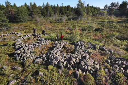 Fornminne, radhustomtningar på Boskär, Mickelsörarna. Fiskeläge från 1500-talet efter Kristus. Hamnar behövdes inte på den jämna marken som bildade en skyddad lagun mot sydöst. Foto Mikael Herrgård.