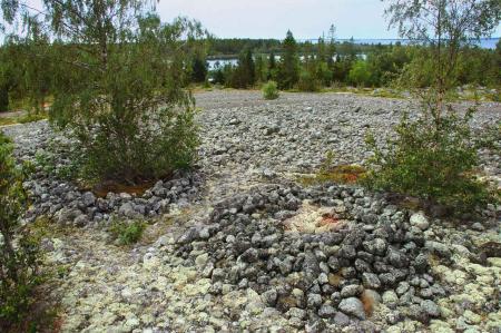 Fornminne, röse och tomtning på Sillskatans (Märaskär) 15-meters krön på Mickelsörarna. De många olika lämningarna tyder på sälfångst. Foto Mikael Herrgård.