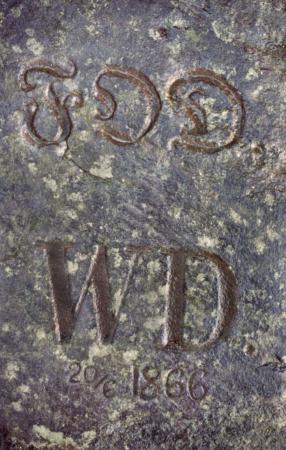 Fornminne, inristning på Snäröuran i Västerhankmo. Holmen fungerade som kyrkoherde Frans Oscar Durchmans sommarviste. På holmen finns ca tio minnesristningar från åren 1866-67. Överst kyrkoherdens initialer FOD i fraktur, under WD i antikva efter Wendla som både hustrun och dottern hette. Västerhankmo hembygdsförening restaurerade ristningarna 1995. Foto Mikael Herrgård.