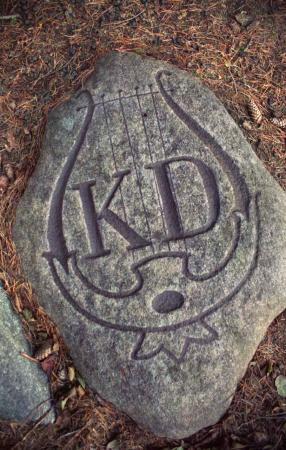Fornminne, inristning på Snäröuran i Västerhankmo. Holmen fungerade som kyrkoherde Frans Oscar Durchmans sommarviste. På holmen finns ca tio minnesristningar från åren 1866-67. KD med lyran bör vara Knut, kusin till Gustaf. Västerhankmo hembygdsförening restaurerade ristningarna 1995. Foto Mikael Herrgård.