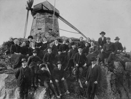 Holms kvarn i Rökiö, Vörå. Bilden från främre delen av 1900-talet visar sannolikt en elevgrupp från platsens folkhögskola. Uppgifter saknas dock om ungdomarna och fotografen.